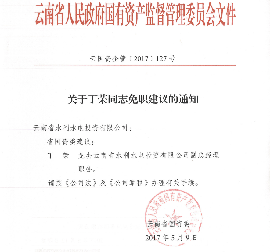 云南省國資委關(guān)于丁榮同志免職建議的通知